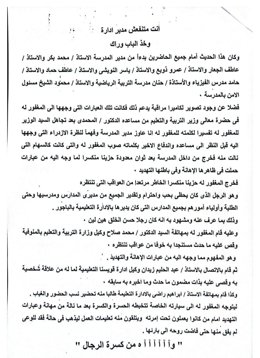 ومن جانبه أكد الدكتور محمد صلاح وكيل وزارة التربية والتعليم بالمنوفية في منشور له عبر مواقع التواصل الاجتماعي أن الراحل أسامة بسيوني أبلغه في مكالمة هاتفيه أن الدكتور أحمد المحمدي وجه له اللوم وطالبه بالتوجه إلى مكتبه بالعاصمة الإدارية وأوضح له رغبة الوزير باستكمال الجولة دون قيادات المديرية أو الإدارة.