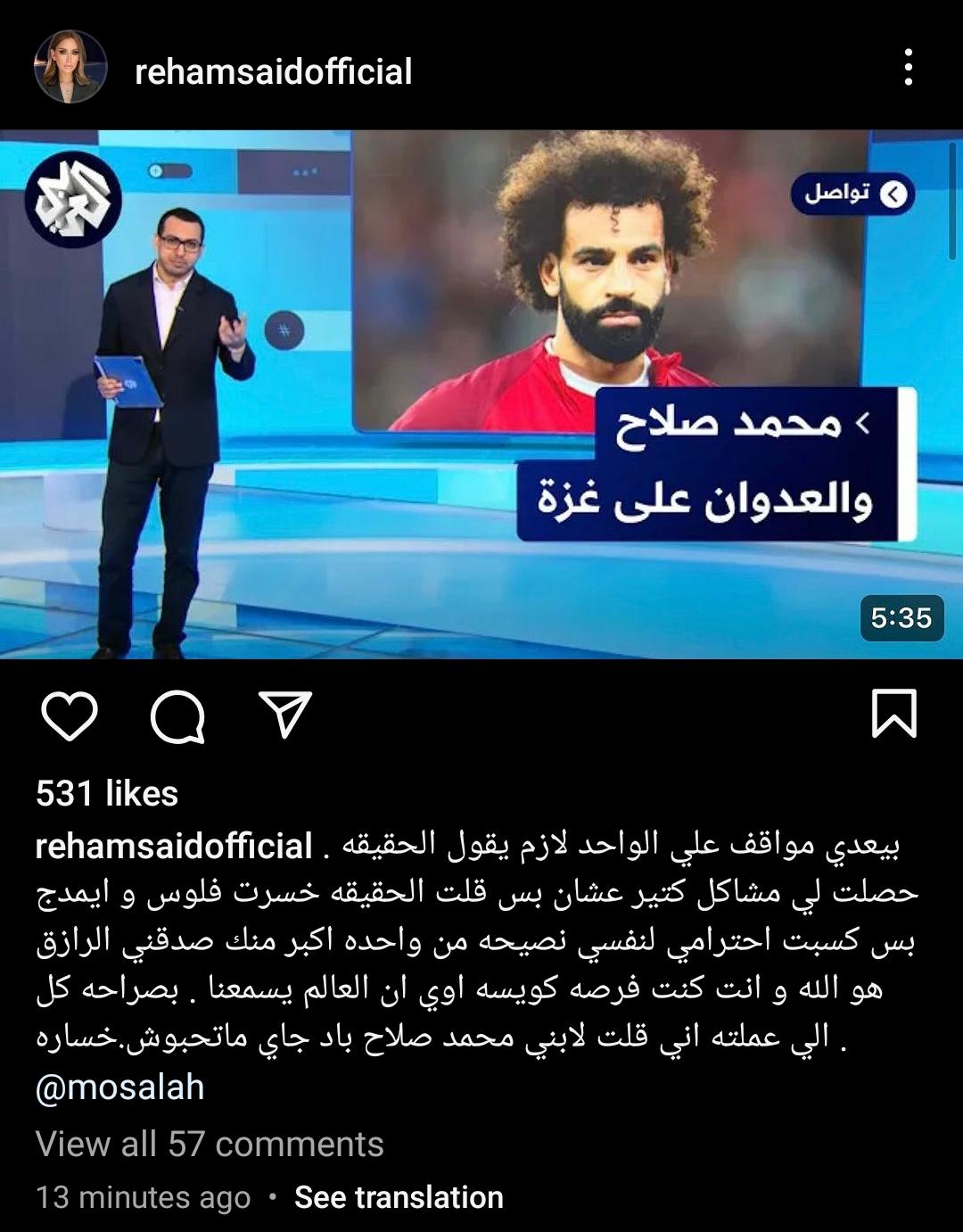حرصت المذيعة ريهام سعيد على توجيه رسالة للاعب كرة القدم العالمي محمد صلاح، بسبب عدم تعليقه على أحداث غزة، وذلك من خلال منشور عبر حسابها الشخصي على موقع تبادل الصور والفيديوهات إنستجرام.