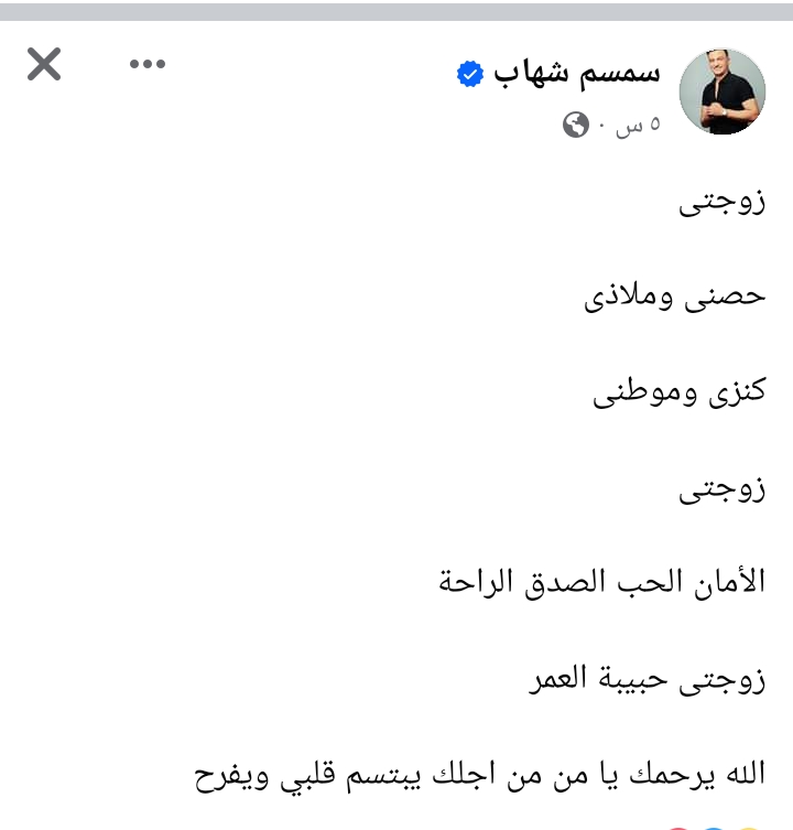 وكتب سمسم شهاب عبر حسابه على فيسبوك، جاء فيه: «زوجتي حصني وملاذي، كنزي وموطني، الأمان الحب الصدق الراحة، زوجتي حبيبة العمر، الله يرحمك يا من أجلك يبتسم قلبي ويفرح».