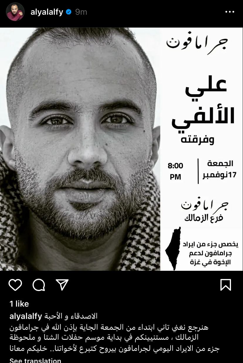 ونشر «علي» البوستر الرسمي للحفل عبر حسابه الرسمي بموقع التواصل الاجتماعي «فيسبوك»، معلنًا عن التبرع بجزء من أرباح الحفل لأهالي فلسطين.