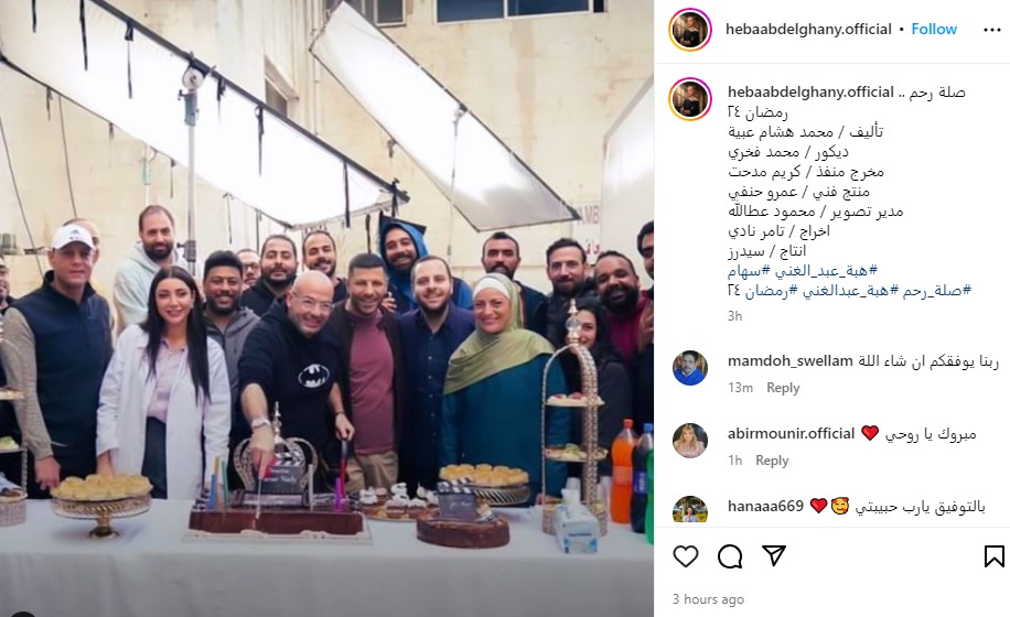 ونشرت هبة عبد الغني الصورة عبر حسابها على انستجرام وعلقت قائلة: "مسلسل صلة رحم.. رمضان 2024، والعمل من تأليف محمد هشام عبية وديكور محمد فخري، ومخرج منفذ كريم مدحت، ومنتج فني عمرو حنفي، ومدير تصوير محمود عطا الله، وإخراج تامر نادي".
