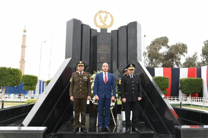 محافظ الفيوم ومدير الأمن والمستشار العسكري يضعون إكليلاً من الزهور على النصب التذكاري لشهداء الشرطة