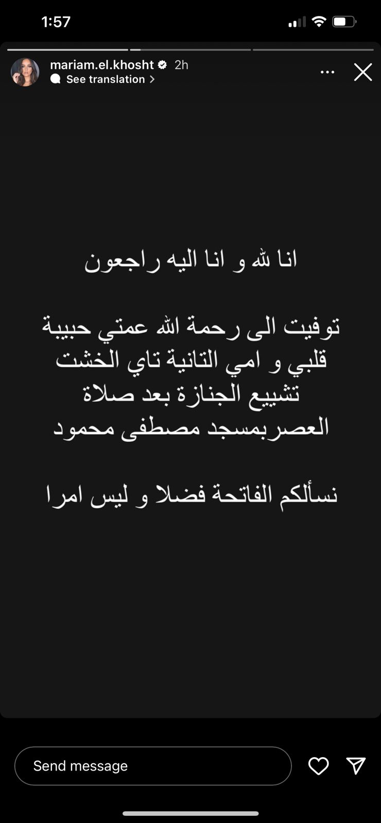 وكتبت مريم الخشت، منشورًا عبر حسابها الشخصي بموقع إنستجرام، وقالت: إنا لله وإنا إليه راجعون توفيت إلى رحمة الله عمتي حبيبة قلبي وأمي التانية تاي الخشت، تشييع الجنازة بعد صلاة العصر بمسجد مصطفى محمود، نسألكم الفاتحة فضلًا وليس أمرا.