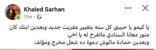 وكتب خالد سرحان، منشورًا عبر حسابه الشخصي بموقع فيسبوك، جاء فيه: يا كيمو يا حبيبي كل سنة بنغير عفريت جديد، وبعدين ابنك كان منور معانا السنادي المفروض تفرح يا أخي، وبعدين حمادة مالوش دعوة ده شغل مخرج ومؤلف.