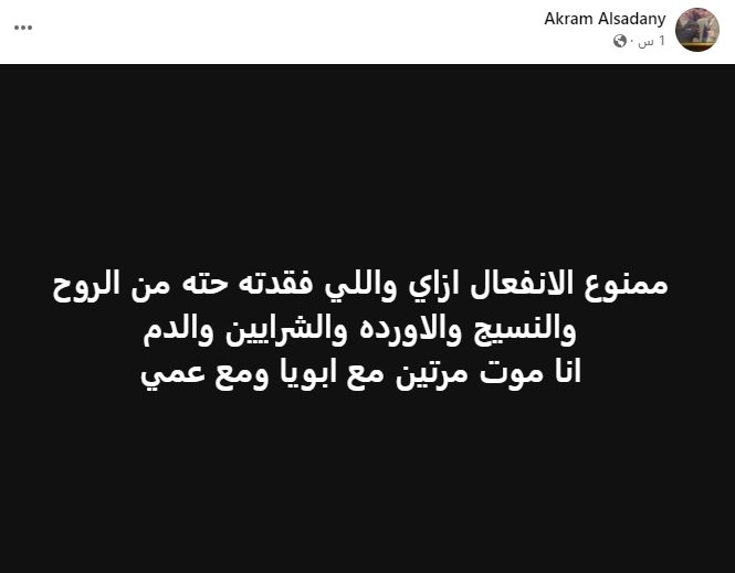 وفي أول تعليق من أكرم السعدني بعد سقوطه في المطار، كتب منشورًا عبر حسابه الشخصي بموقع التواصل الاجتماعي فيسبوك، قال فيه: ممنوع الانفعال إزاي، واللي فقدته حتة من الروح والنسيج والأوردة والشرايين والدم، أنا موت مرتين مع أبويا وعمي.