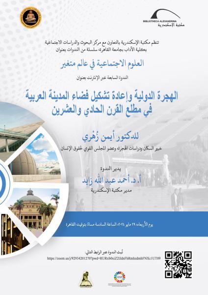 تنظم مكتبة الإسكندرية من خلال برنامج دراسات التنمية المستدامة وبناء قدرات الشباب ودعم العلاقات الإفريقية بقطاع البحث الأكاديمي بالمكتبة، ندوة بعنوان "الهجرة الدولية وإعادة تشكيل فضاء المدينة العربية في مطلع القرن الحادي والعشرين" للدكتور أيمن زُهْري؛ خبير السكان ودراسات الهجرة وعضو المجلس القومي لحقوق الإنسان بجمهورية مصر العربية، وذلك يوم الأربعاء الموافق 29مايو 2024، الساعة السادسة مساءً بتوقيت القاهرة عبر الانترنت.