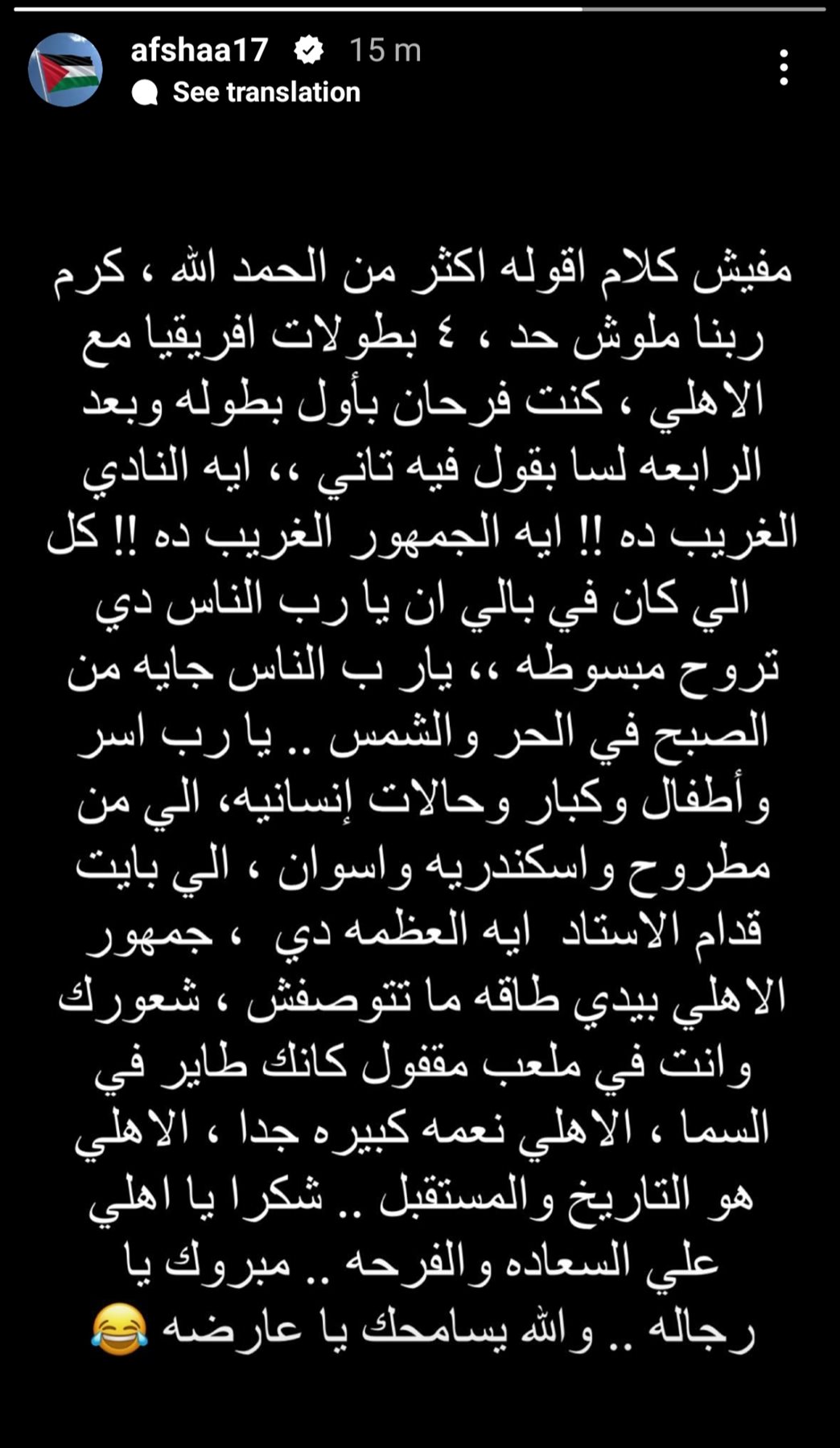 واحتفل أفشة بفوز الأهلي، عبر ستوري انستجرام، قائلا: