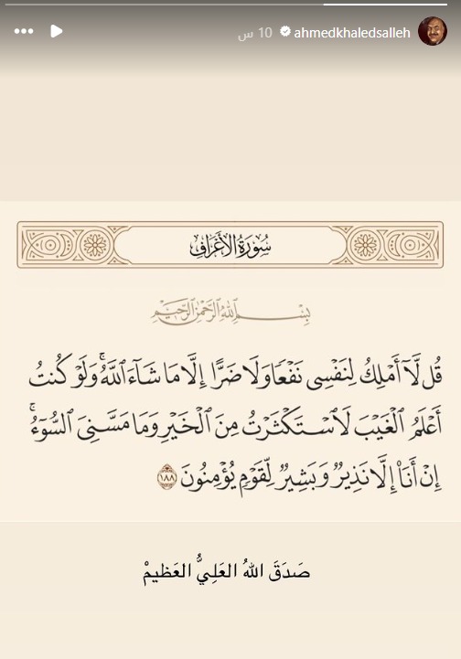 وكتب أحمد خالد صالح وهنادي مهنا آية قرآنية، عبر ستوري بـ حسابيهما بموقع تبادل الصور والفيديوهات القصيرة انستجرام، جاء نصها: (قل لا أملك لنفسي نفعًا ولا ضرًا إلا ما شاء الله، ولو كنت أعلم الغيب لا ستكثرت من الخير وما مسني السوء، إن أنا إلا نذير وبشير لقوم يؤمنون).