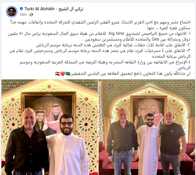 ونشر تركي آل الشيخ، صورة له تجمعه مع عمرو الفقي الرئيس التنفيذي والعضو المنتدب للشركة المتحدة للخدمات الإعلامية، وقال: اجتماع مثمر ومهم مع أخي العزيز الأستاذ عمرو الفقي الرئيس التنفيذي للشركة المتحدة واتفاقات مهمة جدًا ستكون قفزة كبيرة.