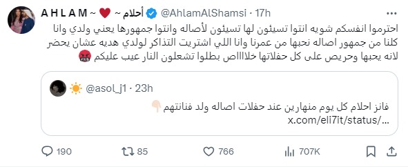 وقررت أحلام الخروج عن صمتها لترد بقوة قائلة: ‘احترموا انفسكم شوية أنتم تسيئون لها، تسيئون لأصالة وانتوا جمهورها، يعني ولدي وأنا كلنا من جمهور أصالة نحبها من عمرنا، وأنا اللي اشتريت التذاكر لولدي هدية عشان يحضر لأنه يحبها وحريص على كل حفلاتها خلاص بطلوا تشعلون النار عيب عليكم’.