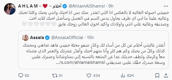بينما ردت أصالة على أحلام قائلة: “أعتذر غاليتي أحلام عن كل من أساء لك وكدّر صفو محبّة حبيبي فاهد تجاهي ومحبتك كذلك وكلّ من يحبك وكم هم كثر وأنا منهم أحبك وأقدّر عشرتك والعمر الذي عشناه معًا وكرمك ولطف حديثك عن المتعة بالنسبة إلي بمناوشاتنا وصبرك علي وسعة صدرك حقّك علي صديقتي”.