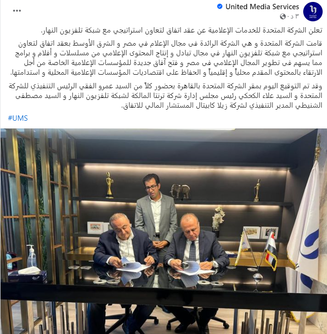 وأضافت الشركة المتحدة فى بيانها : قد تم التوقيع اليوم بمقر الشركة المتحدة بالقاهرة بحضور كلًا من السيد عمرو الفقي الرئيس التنفيذي للشركة المتحدة والسيد علاء الكحكي رئيس مجلس إدارة شركة ترنتا المالكة لشبكة تلفزيون النهار والسيد مصطفى الشنيطي المدير التنفيذي لشركة زيلا كابيتال المستشار المالي للاتفاق.