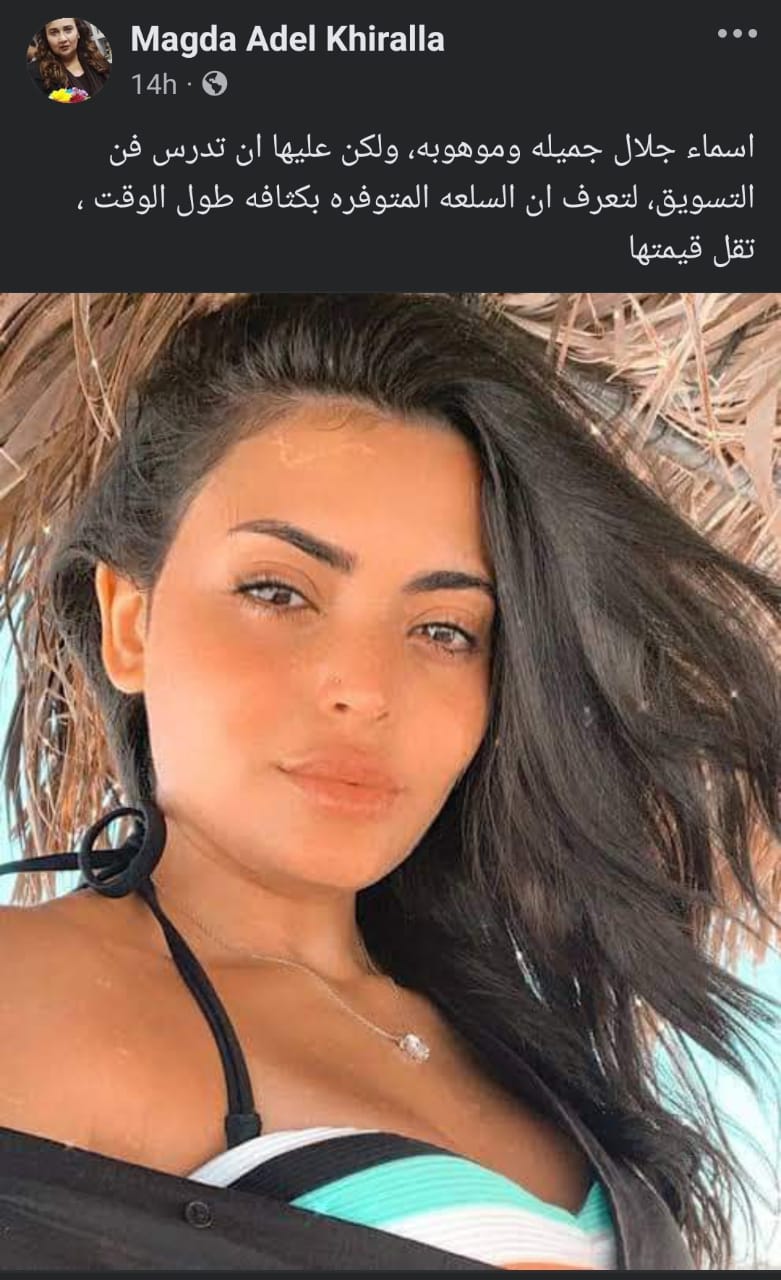 كتبت ماجدة خير الله منشورا على صفحتها الرسمية عبر موقع التواصل الاجتماعي فيسبوك وعلقت قائلة : أسماء جلال جميلة وموهوبة، ولكن عليها أن تدرس فن التسويق لتعرف أن السلعة المتوفرة بكثافة طول الوقت تقل قيمتها.