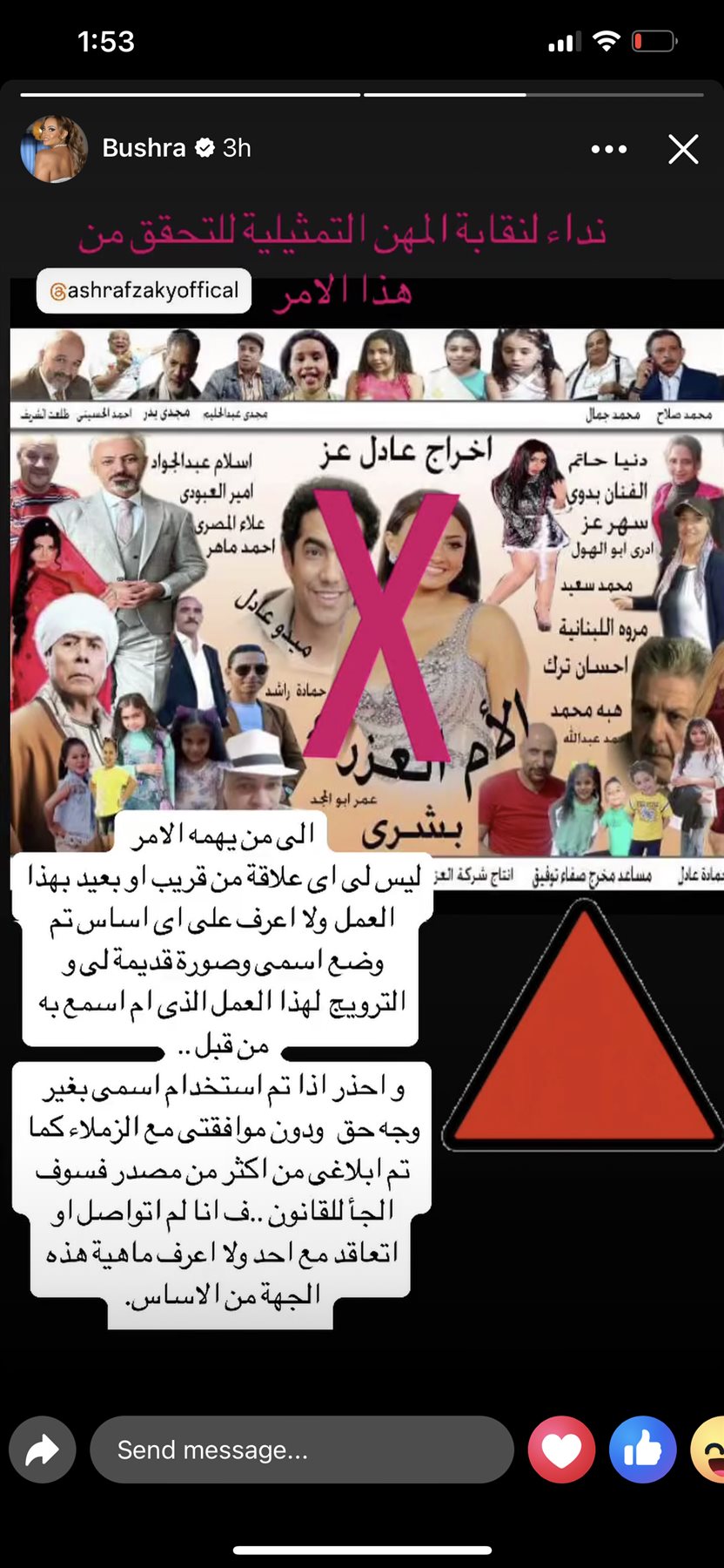 وكتبت بشرى عبر حسابها الشخصي بموقع انستجرام: نداء لنقابة المهن التمثيلية للتحقيق في هذا الأمر.
