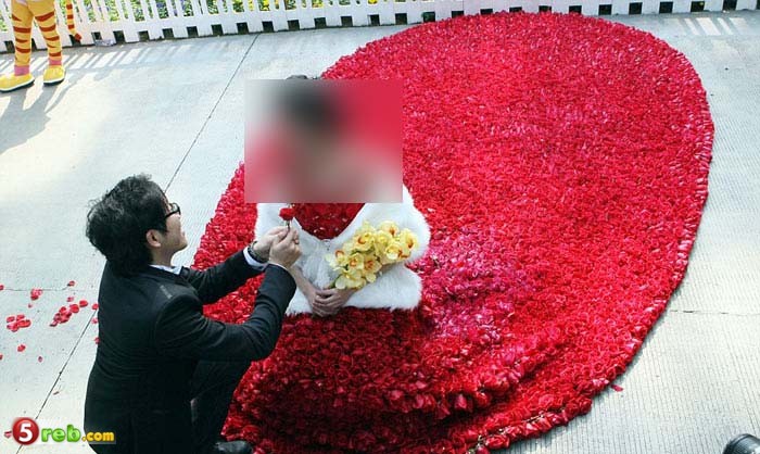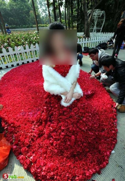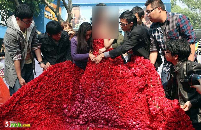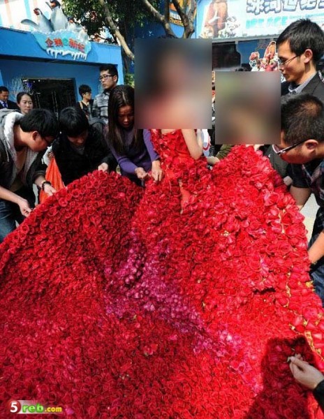 صنع رجل صيني، لصديقته فستانا من الورد الخالص، مستخدما 9,999 وردة طبيعية حمراء، لكي يتقدم من التقدم إليها وطلبها للزواج.وذكرت وسائل إعلامية أن "الصيني شياو فان تقدم لطلب يد حبيبته يين مي، بطريقة مميزة تتناسب مع ولعها الخاص بالأزياء والموضة, بحيث قدم لها فستانا من الورد الخالص أستخدم في صناعته 9,999 وردة طبيعية حمراء".وتم صف الأزهار جنبا إلى جنب بواسطة فريق عمل أستمر بالعمل على مدار الساعة في أجواء رطبة وباردة نسبيا للمحافظة على بتلات الورد كي لا تذبل وتفقد لونها الأحمر المميز.وطلب شياو يد صديقته يين في متنزه تشايم لونج الترفيهي وهو أحد معالم الجذب السياحي في جوانجدونج في جنوب الصين
