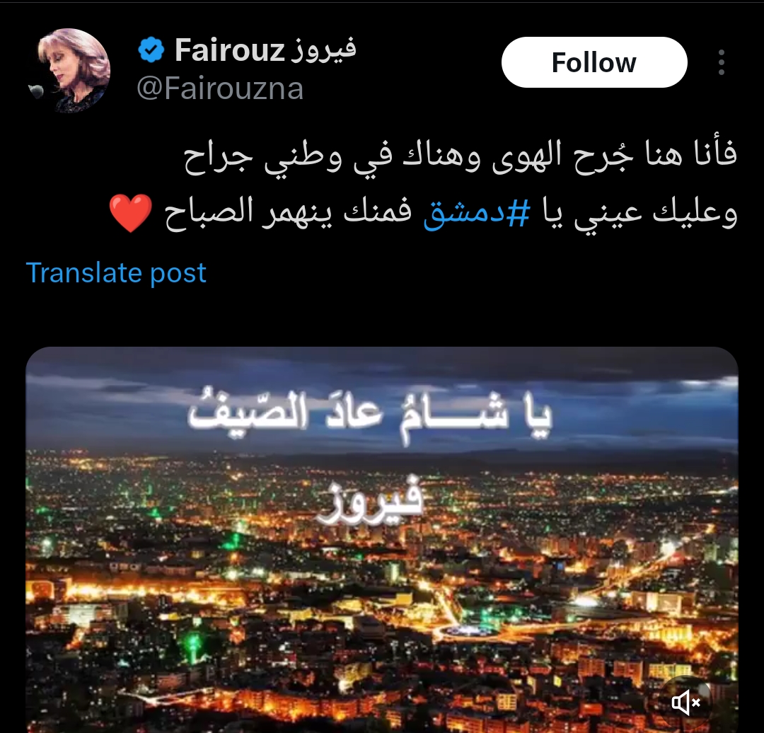 كتبت فيروز تغريدة على صفحتها الرسمية عبر منصة "إكس" وعلقت قائلة : "فأنا هنا جرح الهوى وهناك في وطني جراح، وعليك عيني يا دمشق فمنك ينهمر الصباح" .
