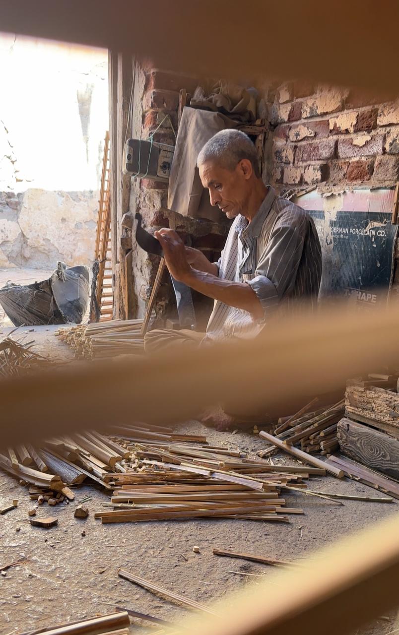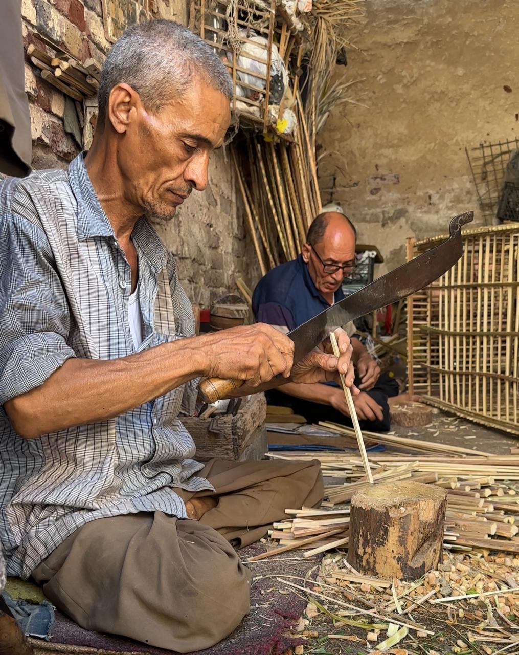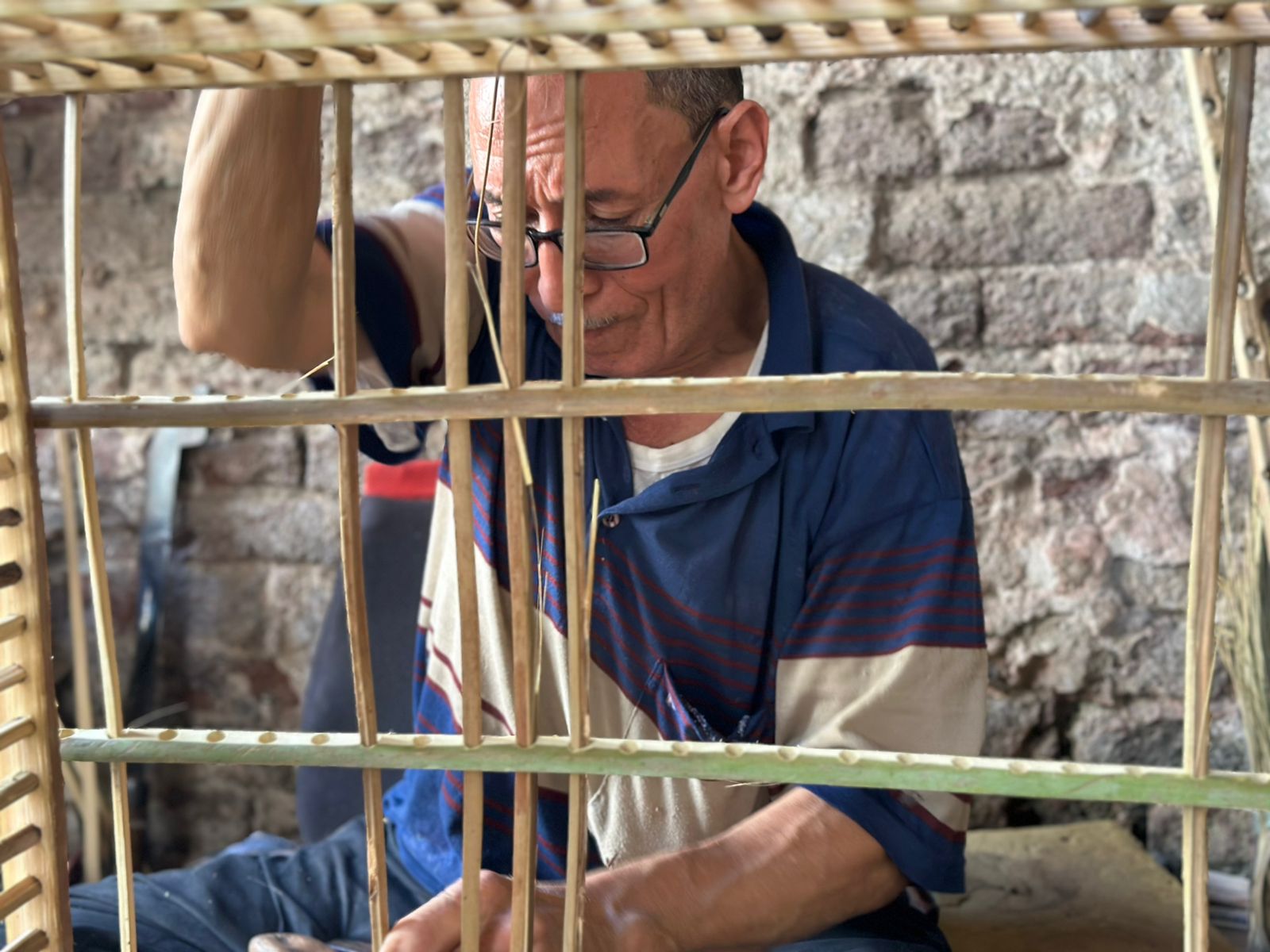 وأضاف القفاص "خميس محمد فضل" وهو الشقيق الأصغر: أنا وشقيقي محمد لم نكمل تعليمنا، بل تتلمذنا وغرقنا في بحر حرفتنا لصناعة الأقفاص، نذهب سويًا إلى الورشة في الصباح الباكر ونظل نعمل حتى السابعة مساءًا دون راحة، مهنة صعبة وتحتاج إلى تركيز، وتحتاج إلى مقاسات وتعديل في الجريد، ولكننا مع الخبرة أصبحت أعيننا وأيدينا كالمسطرة والميزان، نأتي أولاً بجريد النخل ونقوم بتقطيعه على حسب المطلوب وكل هذا يدويا دون تدخل الماكينات.