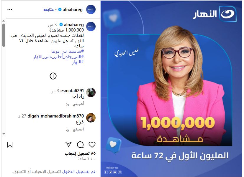 ونشرت قناة النهار صورة عبر إنستجرام وعلقت: لقطات جلسة تصوير لميس الحديدي في النهار تسجل مليون مشاهدة خلال ٧٢ ساعه شاشتنا سر قوتنا، اللي جاي أحلى على النهار.