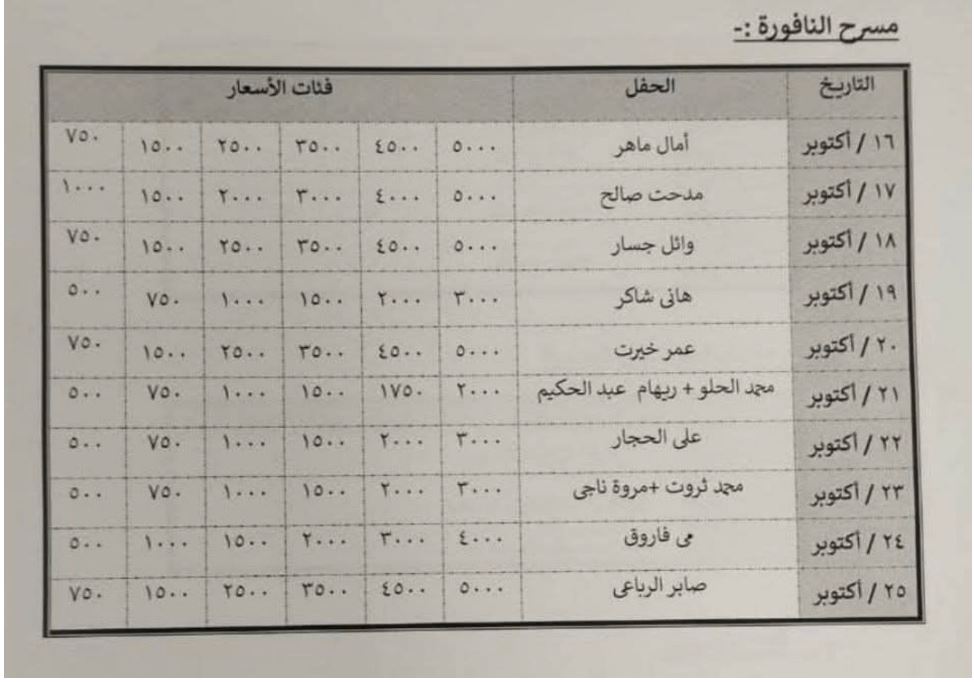 ويقدم الفنان اللبناني وائل جسار حفلا غنائيا على مسرح النافورة يوم 18 أكتوبر المقبل، وتأتي فئات التذاكر كالتالي: