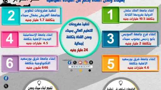 تجدر الاشارة الي أن الدولة نفذت العديد من المشروعات في مجال التعليم العالي بسيناء ومدن القناة، بتكلفة إجمالية بلغت 24 مليار جنيه، وذلك في إطار الاهتمام الكبيرً من الدولة بتنمية شبه جزيرة سيناء ومدن القناة، تنفيذاً لتوجيهات الرئيس عبدالفتاح السيسي .