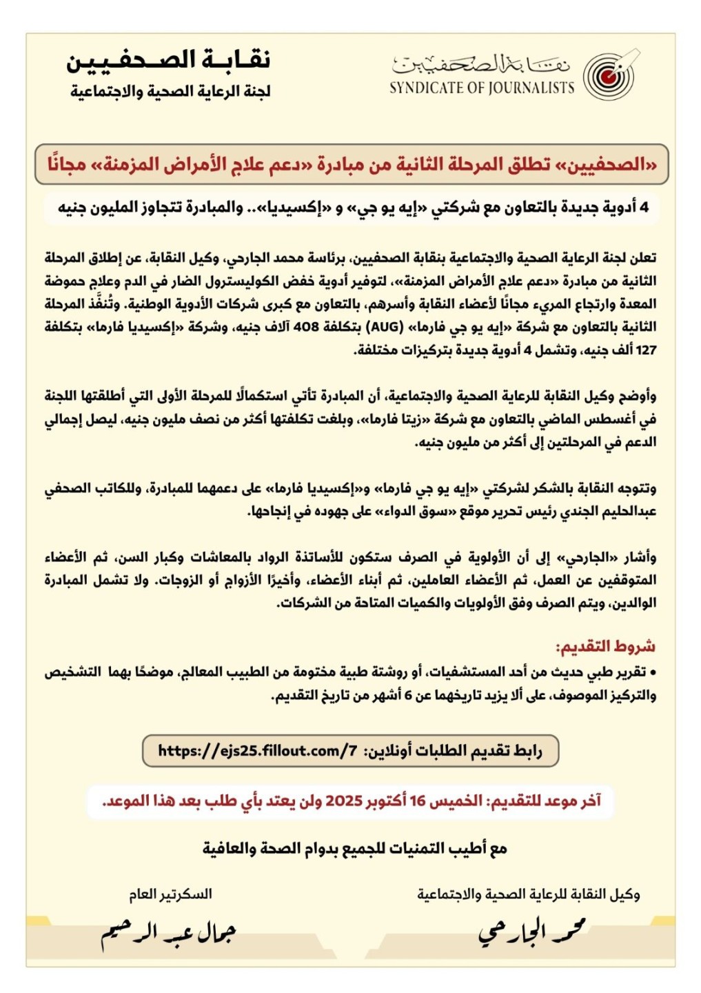 تعلن لجنة الرعاية الصحية والاجتماعية بنقابة الصحفيين، برئاسة محمد الجارحي، وكيل النقابة، عن إطلاق المرحلة الثانية من مبادرة «دعم علاج الأمراض المزمنة»، لتوفير أدوية خفض الكوليسترول الضار في الدم وعلاج حموضة المعدة وارتجاع المريء مجانًا لأعضاء النقابة وأسرهم، بالتعاون مع كبرى شركات الأدوية الوطنية. وتُنفَّذ المرحلة الثانية بالتعاون مع شركة «إيه يو جي فارما» (AUG) بتكلفة 408 آلاف جنيه، وشركة «إكسيديا فارما» بتكلفة 127 ألف جنيه، وتشمل 4 أدوية جديدة بتركيزات مختلفة.