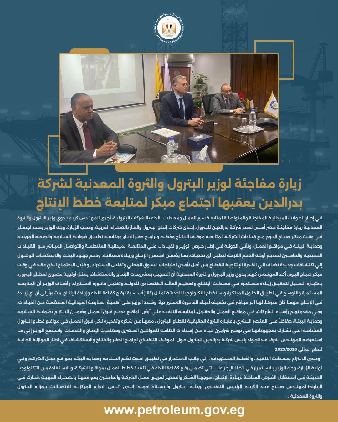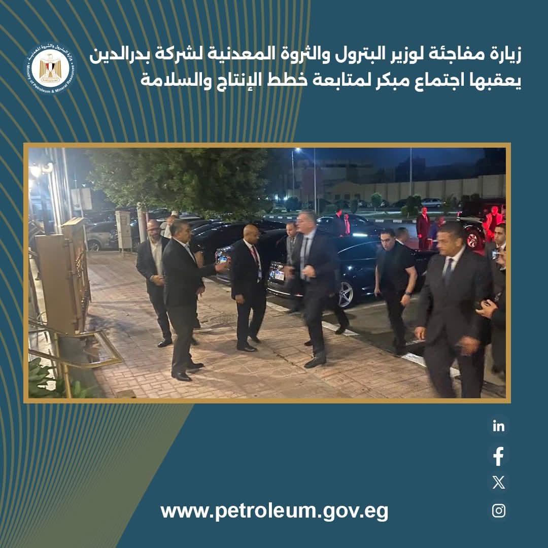زيارة مفاجئة لوزير البترول لشركة بدرالدين يعقبها اجتماع مبكر لمتابعة خطط الإنتاج والسلامة