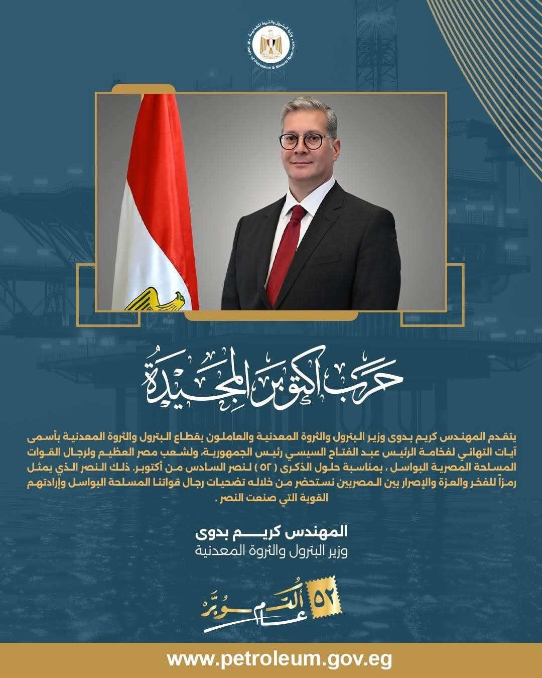 تقدَّم المهندس كريم بدوي، وزير البترول والثروة المعدنية، وجميع العاملين بقطاع البترول والثروة المعدنية، بأسمى آيات التهاني إلى فخامة الرئيس عبد الفتاح السيسي رئيس الجمهورية، وإلى الشعب المصري العظيم، ورجال القوات المسلحة الأبطال، بمناسبة حلول الذكرى الـ52 لنصر السادس من أكتوبر المجيد.
