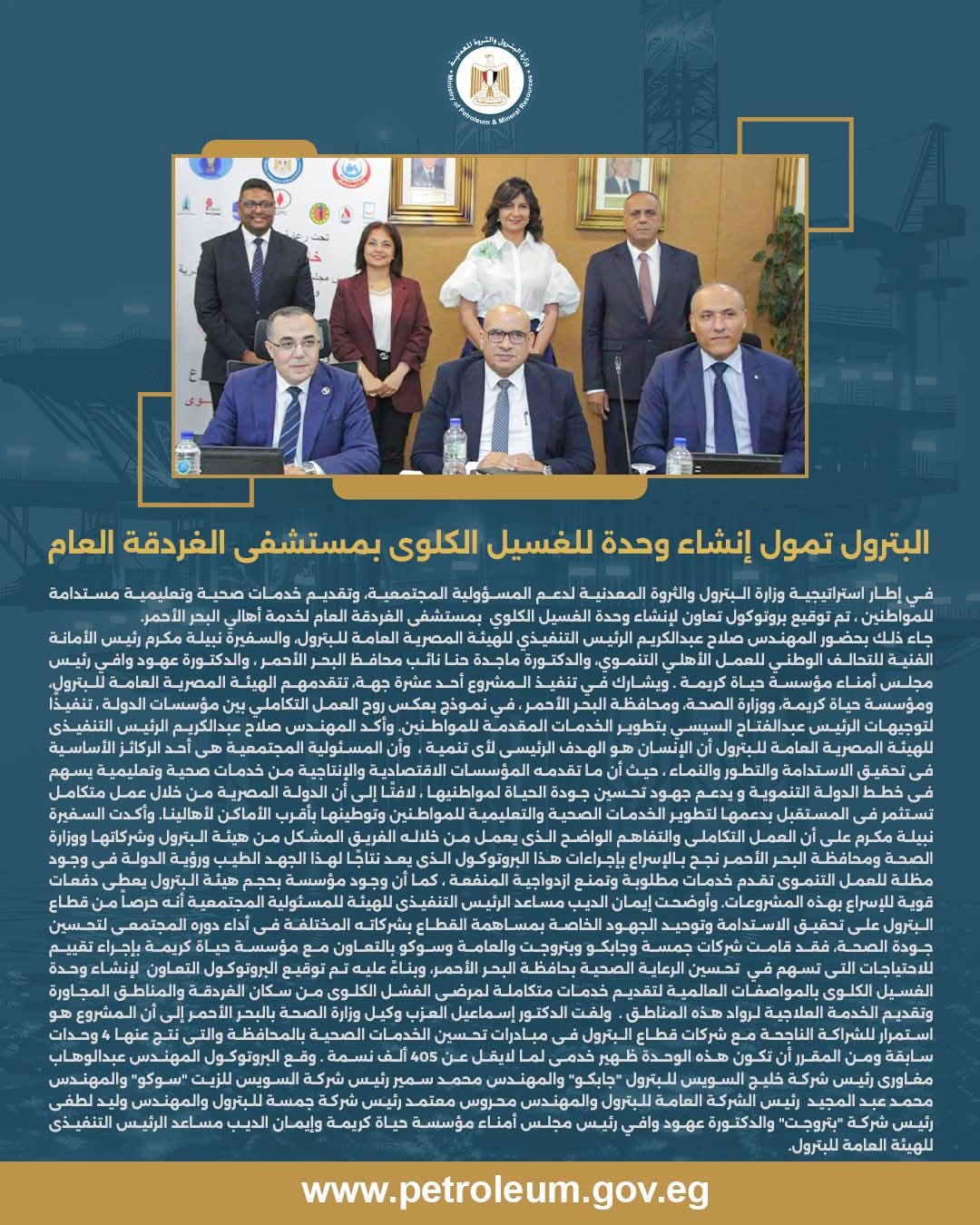 في إطار استراتيجية وزارة البترول والثروة المعدنية لدعم المسؤولية المجتمعية، وتقديم خدمات صحية وتعليمية مستدامة للمواطنين ، تم توقيع بروتوكول تعاون لإنشاء وحدة الغسيل الكلوي بمستشفى الغردقة العام لخدمة أهالي البحر الأحمر.