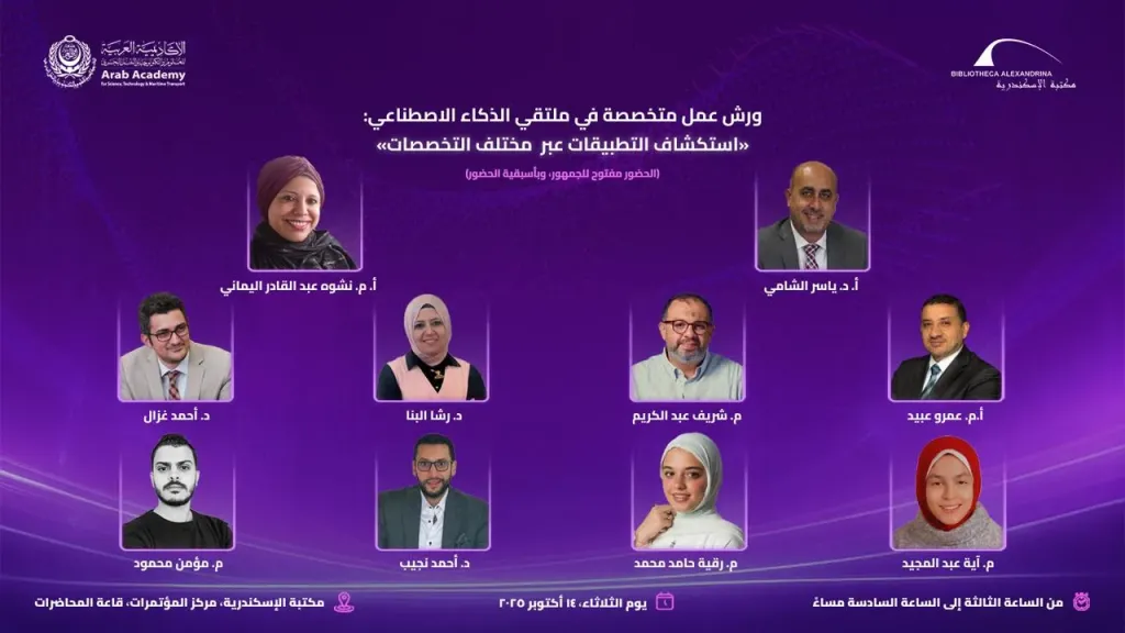 تنظم مكتبة الإسكندرية من خلال إدارة مؤسسات المعلومات والمهارات المهنية بقطاع المكتبات، بالتعاون مع عمادة القبول والتسجيل بالأكاديمية العربية للعلوم والتكنولوجيا والنقل البحري، وتحت إشراف الأستاذ الدكتور محمد عصام خضر، فعاليات التعاون بين المؤسستين للعام الثالث على التوالي ضمن موسم 2025م. والتي تتمثل في ورش عمل متخصصة تُعقد ضمن ملتقى الذكاء الاصطناعي بعنوان "استكشاف التطبيقات عبر مختلف التخصصات"، وذلك في تمام الساعة العاشرة صباحًا، على مدار يومي الاثنين والثلاثاء 13 و14 أكتوبر 2025م.