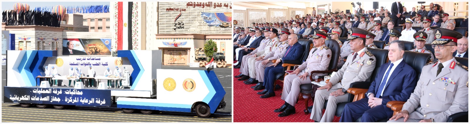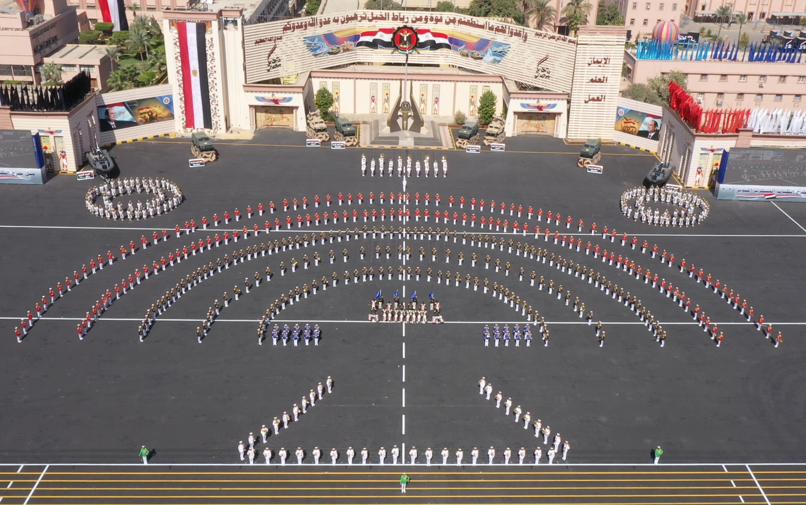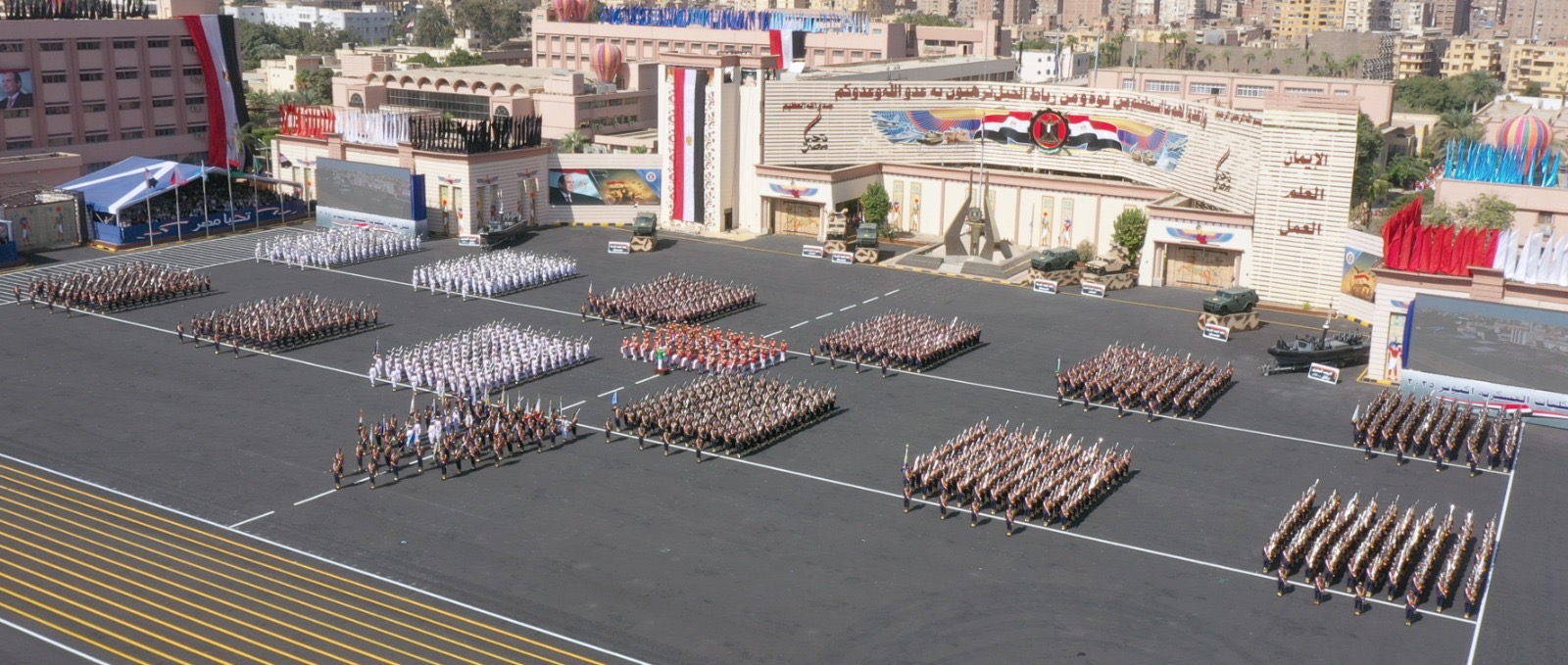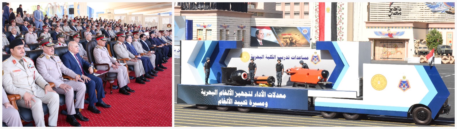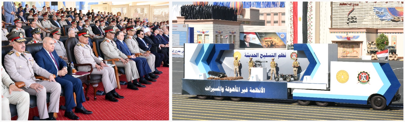 تلى ذلك عرض عدد من نماذج نظم التسليح الحديثة والتى تهدف إلى مواكبة أحدث النظم العلمية والتكنولوجية فى ظل التطور المتسارع فى نظم التسليح المتكاملة والمسيرات ، وقدمت الموسيقات العسكرية عرضاً متميزاً أظهر مدى التوافق الحركى والدقة فى العزف من الحركة.