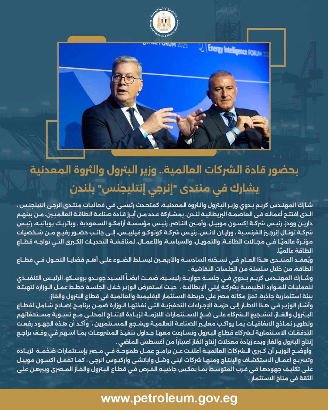 شارك المهندس كريم بدوي وزير البترول والثروة المعدنية، كمتحدث رئيسى في فعاليات منتدى انرجى انتيلجنس ، الذى افتتح أعماله فى العاصمة البريطانية لندن، بمشاركة عدد من أبرز قادة صناعة الطاقة العالميين، من بينهم دارين وودز، رئيس شركة إكسون موبيل، وأمين الناصر، رئيس مؤسسة أرامكو السعودية ، وباتريك بويانيه، رئيس شركة توتال إنرجيز الفرنسية ، ورايان لانس، رئيس شركة كونوكو فيليبس، إلى جانب حضور رفيع من شخصيات مؤثرة عالميًا في مجالات الطاقة، والتمويل، والسياسة، والأعمال، لمناقشة التحديات الكبرى التي تواجه قطاع الطاقة عالميًا.