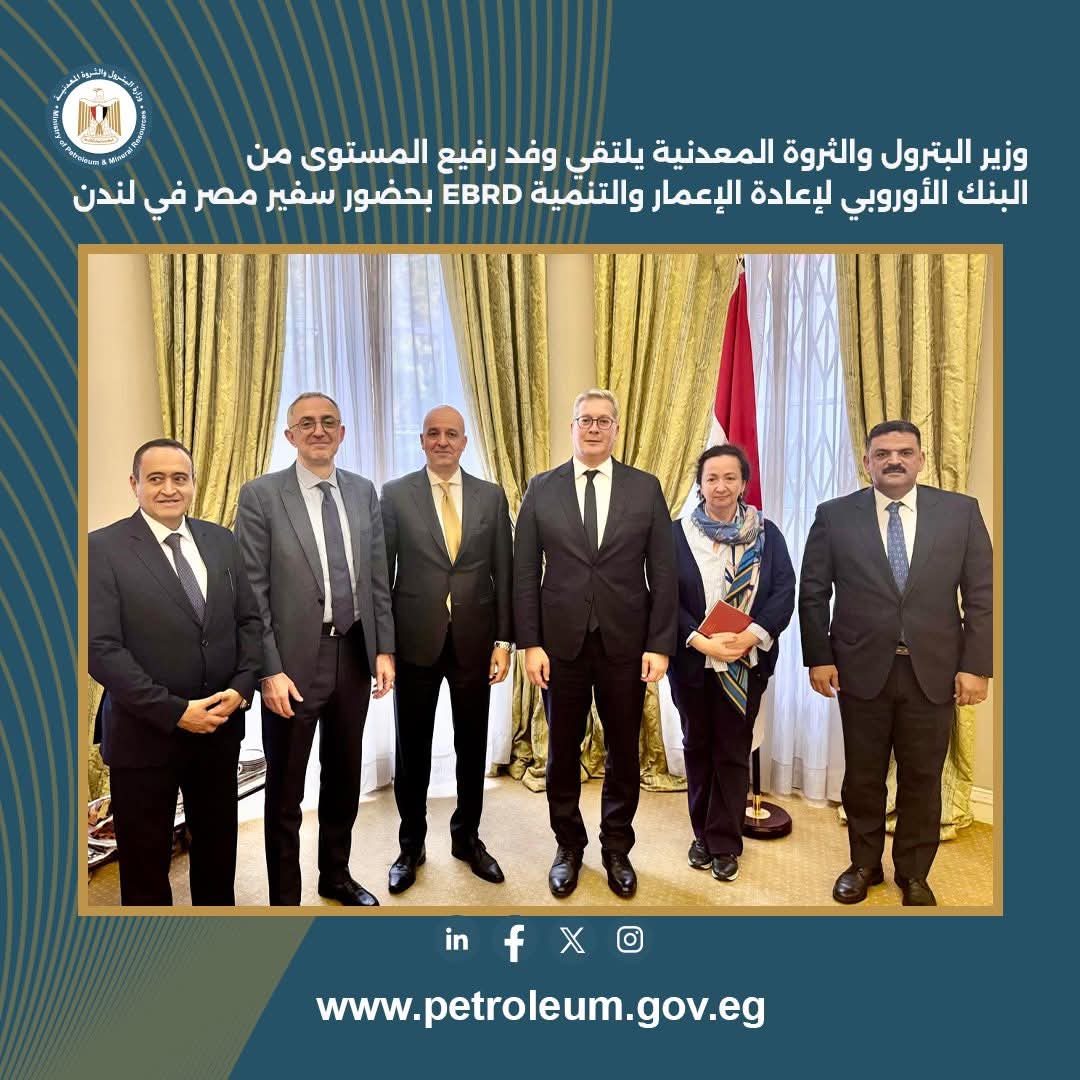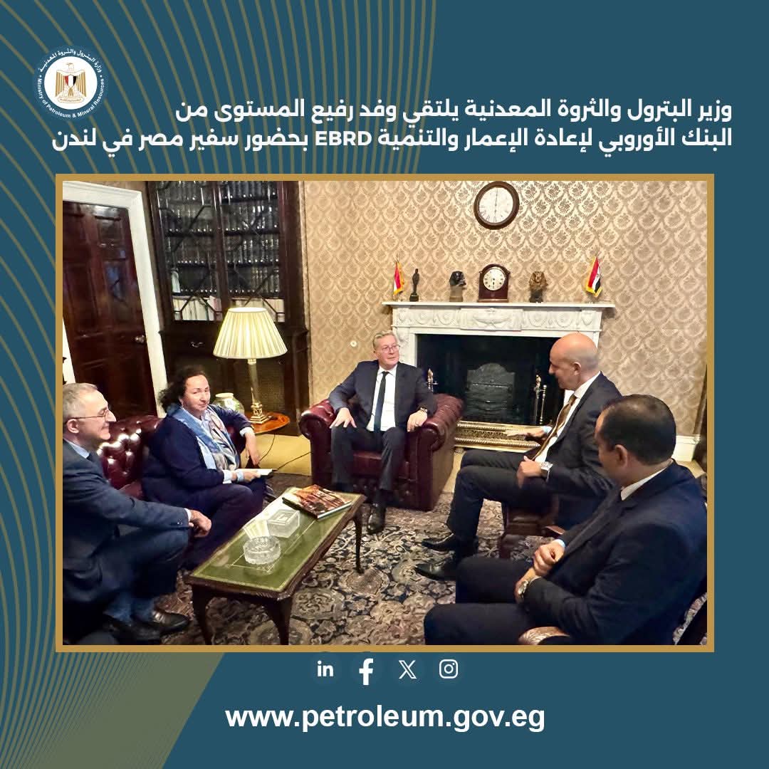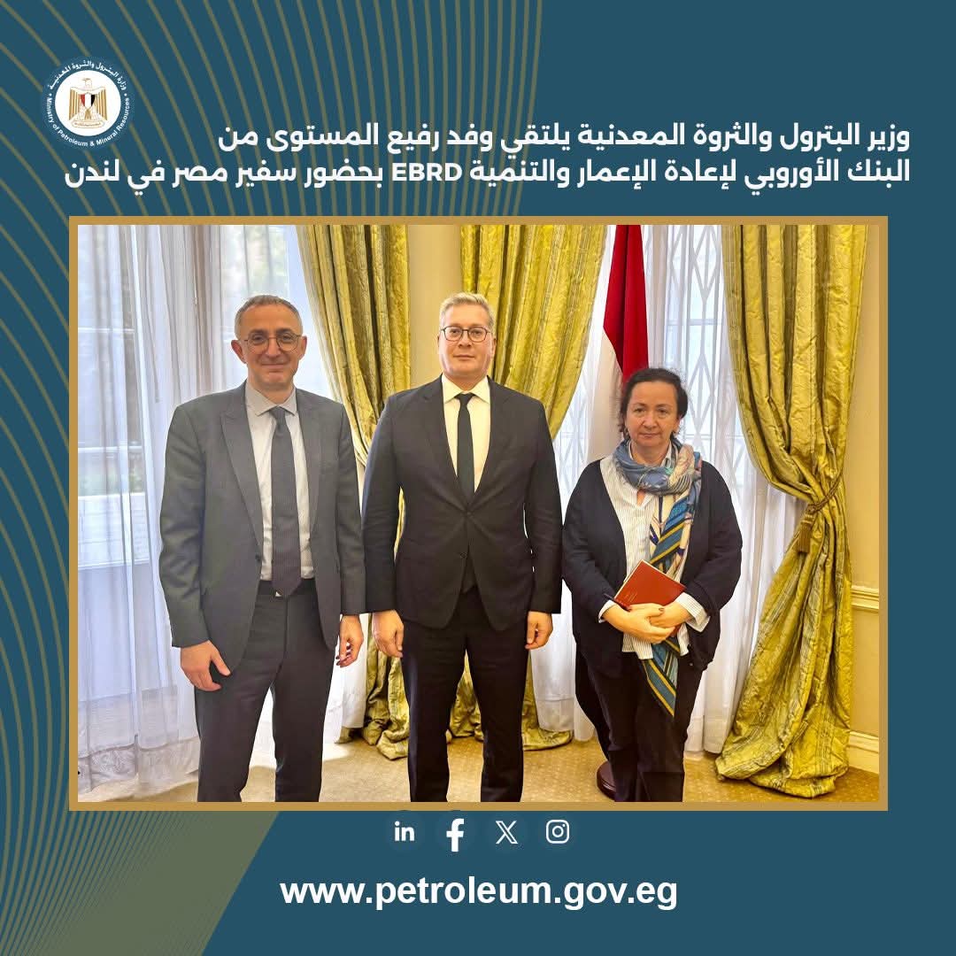 رئيسة قطاع الموارد الطبيعية العالمية والسيد جانبييرو ناتشي المدير الإداري لإستراتيجية المناخ و آليات التنفيذ ، حيث تم مناقشة توسيع الشراكة الاستراتيجية بين قطاع البترول والبنك الأوروبي لإعادة الإعمار والتنمية لتشمل التعاون في قطاع التعدين، و استعراض التطورات المستمرة التي يشهدها هذا القطاع في مصر لتهيئة بيئة استثمارية أكثر جذبًا من خلال تحديث الأطر التشريعية والتنظيمية، إلى جانب الجهود الجارية لتنفيذ آليات جديدة تزيد جاذبية فرص الاستثمار ، من خلال مشروع المسح الجوي والجيوفيزيائي لمناطق تواجد المعادن والذي تجهز الوزارة لتنفيذه و يمثل أحد مجالات التعاون المحتملة مع البنك الأوروبي .