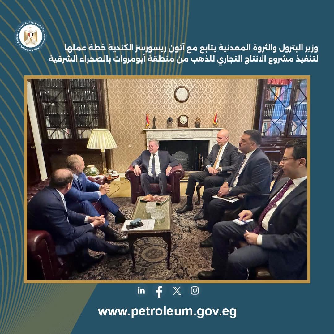 كما شملت اللقاءات السيد تونو فاك الرئيس التنفيذي لشركة آتون ريسورسز الكندية والمهندس شريف بركات مدير عام الشركة في مصر ، حيث تم استعراض خطط عمل آتون ريسورسز في منطقة امتياز أبومروات بالصحراء الشرقية بهدف بدء اول انتاج تجاري للذهب في النصف الثاني من عام 2026 ، وجري التأكيد علي تقديم كافة أوجه الدعم لخطط الشركة من أجل زيادة ضخ الإستثمارات وتنفيذ الأهداف الموضوعة .