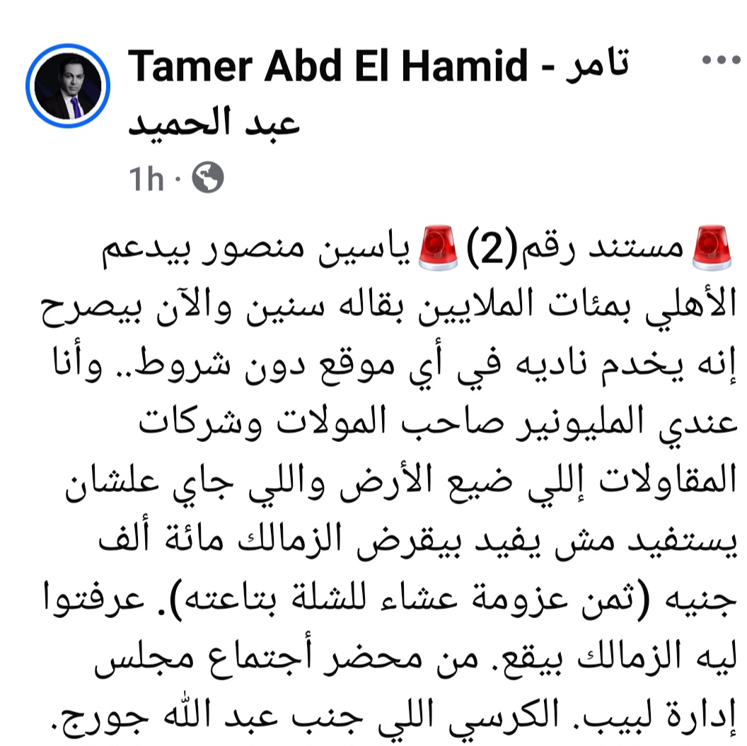 وقال تامر عبدالحميد نجم الزمالك السابق في تصريحاته المثيرة: ياسين منصور بيدعم الأهلي بمئات الملايين بقاله سنين، والنهارده بيقول مستعد يخدم ناديه في أي موقع دون شروط، وأنا عندي المليونير صاحب المولات وشركات المقاولات اللي ضيّع الأرض، واللي جاي علشان يستفيد مش يفيد، بيقرض الزمالك مية ألف جنيه… ثمن عزومة عشاء للشلة بتاعته!.