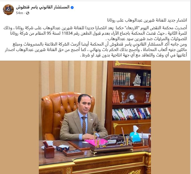 ومن جانبه أكد المستشار القانوني ياسر قنطوش أن المحكمة أيضًا ألزمت الشركة الطاعنة بالمصروفات ومبلغ مائتين جنيه أتعاب المحاماة، وأصبح بذلك الحكم بات ونهائي، كما أصبح من حق الفنانة شيرين عبدالوهاب إصدار أغانيها في أي وقت والتعاقد مع أي جهة إنتاجية بدون قيد أو شرط.