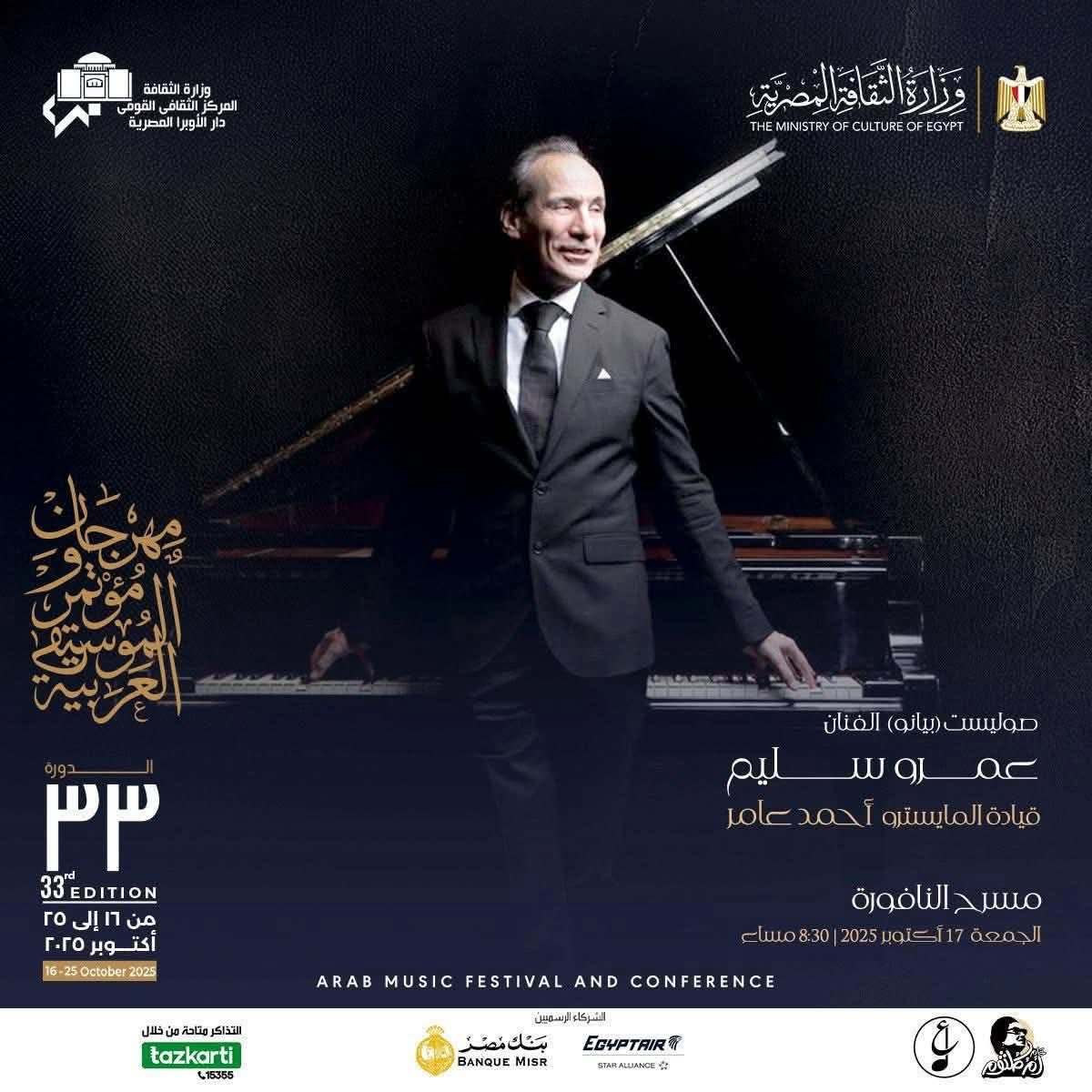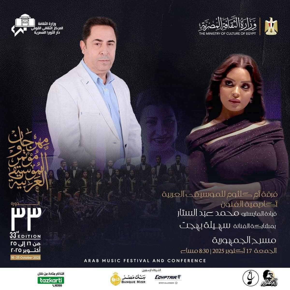 تتواصل فعاليات مهرجان ومؤتمر الموسيقى العربية 33 الذى تقيمه وزارة الثقافة عبر دار الاوبرا المصرية برئاسة الدكتور علاء عبد السلام حيث يقام فى الثامنة والنصف مساء الجمعة 17 اكتوبر 3حفلات على التوازى .