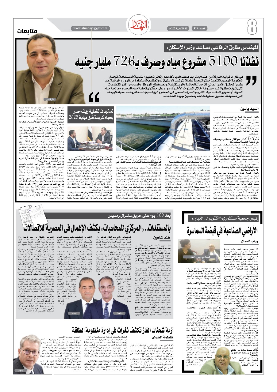 «النهار» أجرت هذا الحوار مع المهندس طارق الرفاعي، معاون وزير الإسكان لقطاع المرافق والمياه، للحديث عن تفاصيل خطة الدولة في هذا الملف الحيوي، وأبرز ما تحقق من إنجازات على أرض الواقع، والرؤية المستقبلية حتى عام 2050، فضلاً عن استعدادات القطاع لمواجهة التغيرات المناخية وتحسين كفاءة التشغيل وترشيد الاستهلاك.