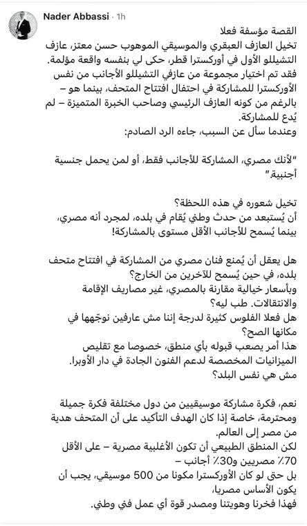 وأكد عباسي أن فكرة مشاركة موسيقيين من دول مختلفة في حد ذاتها “جميلة ومحترمة”، لكن من الطبيعي أن تكون الأغلبية مصرية، قائلًا: “حتى لو كان الأوركسترا يضم 500 موسيقي، يجب أن يكون الأساس مصريًا، فهذا فخرنا وهويتنا.”
