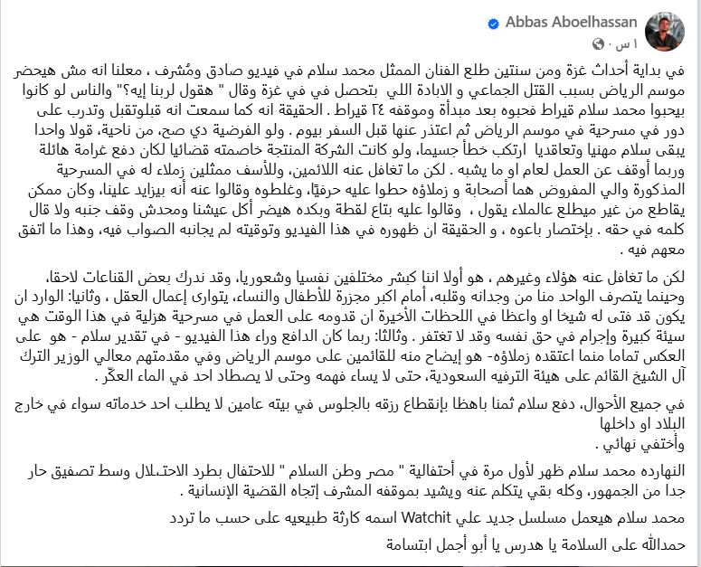 حيث تحدث عباس أبو الحسن عن بداية الأحداث: في بداية أحداث غزة ومن سنتين طلع الفنان الممثل محمد سلام في فيديو صادق ومُشرف ، معلنا انه مش هيحضر موسم الرياض بسبب القتل الجماعي و الابادة اللي بتحصل في في غزة وقال " هقول لربنا إيه؟" والناس لو كانوا بيحبوا محمد سلام قيراط فحبوه بعد مبدأة وموقفه ٢٤ قيراط . الحقيقة انه كما سمعت انه قبلوتقبل وتدرب على دور في مسرحية في موسم الرياض ثم اعتذر عنها قبل السفر بيوم . ولو الفرضية دي صح، من ناحية، قولا واحدا يبقى سلام مهنيا وتعاقديا ارتكب خطأ جسيما، ولو كانت الشركة المنتجة خاصمته قضائيا لكان دفع غرامة هائلة وربما أوقف عن العمل لعام أو ما يشبه.