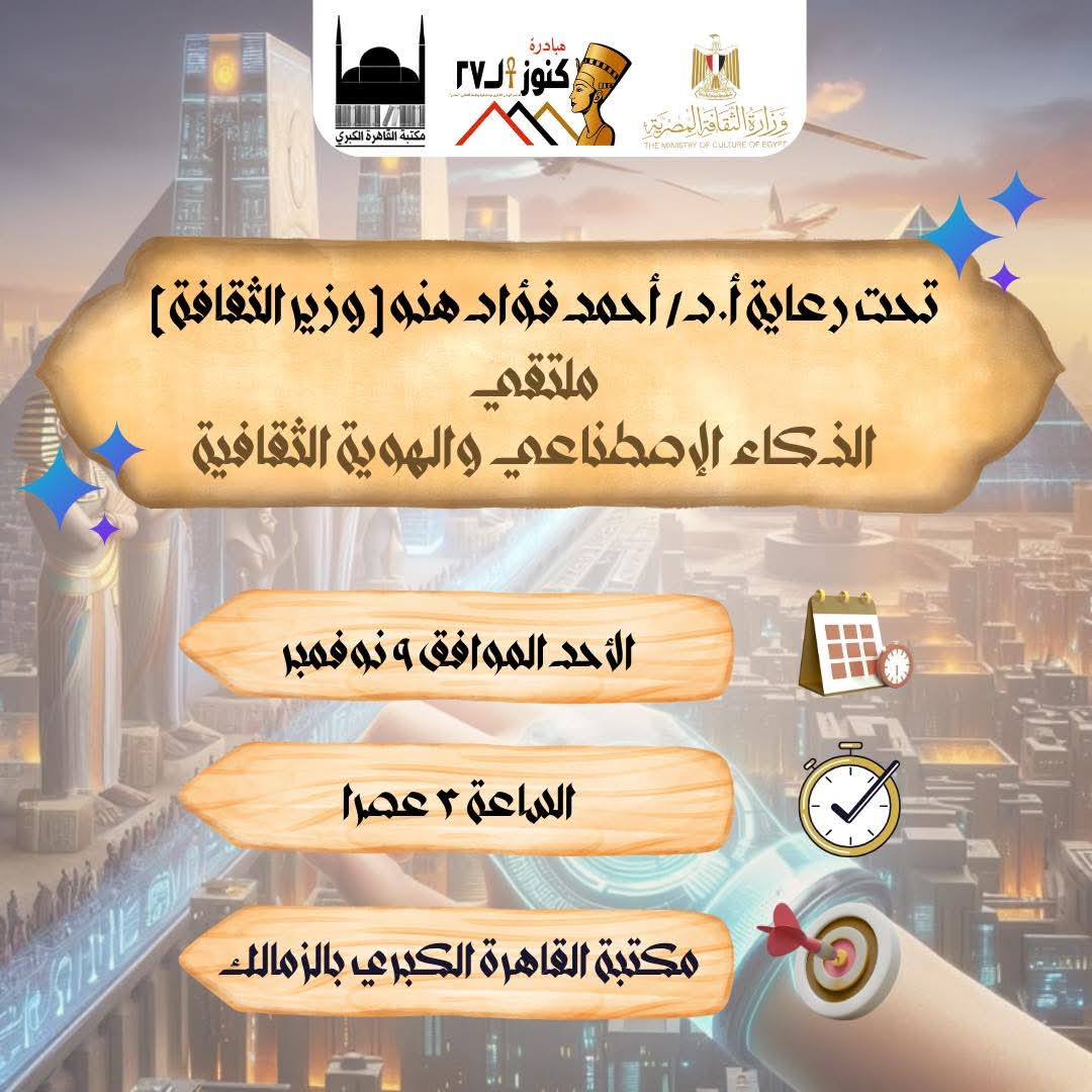 تحت رعاية وزارة الثقافة، تُطلق مبادرة كنوز الـ٢٧ ملتقى فكريا جديدا بعنوان “الذكاء الاصطناعي والهوية الثقافية”، فى الثالثة من مساء يوم الأحد 9 نوفمبر المقبل، في إطار سعي المبادرة الدائم لتعزيز الوعي الثقافي ونشر الفكر الأثري والتاريخي بين الشباب، وذلك بالتعاون مع مكتبة القاهرة الكبرى بالزمالك، التابعة لقطاع المسرح برئاسة المخرج هشام عطوة، وبإشراف الأستاذ يحيى رياض مدير المكتبة .