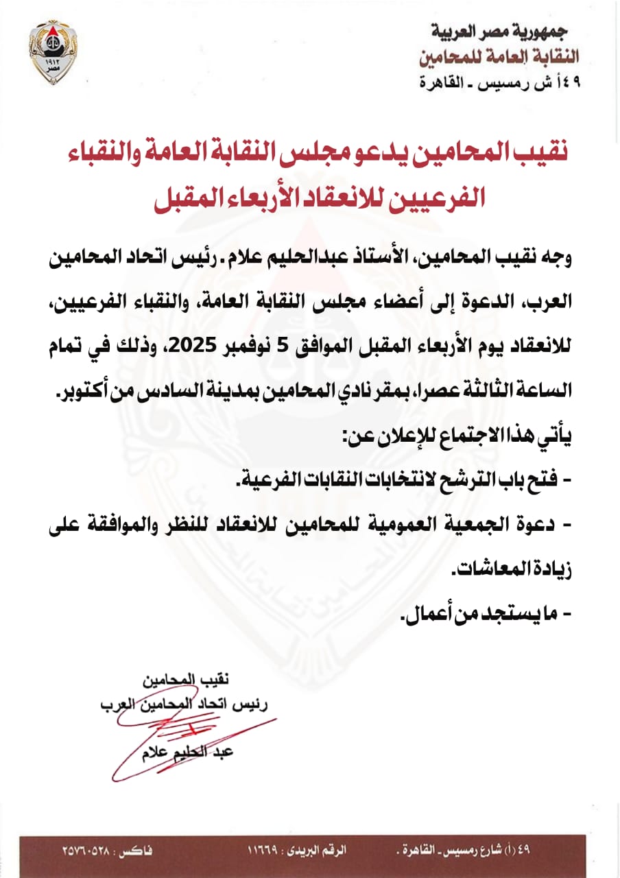 وجه نقيب المحامين، الأستاذ عبدالحليم علام ـ رئيس اتحاد المحامين العرب، الدعوة إلى أعضاء مجلس النقابة العامة، والنقباء الفرعيين، للانعقاد يوم الأربعاء المقبل الموافق 5 نوفمبر 2025، وذلك في تمام الساعة الثالثة عصرا، بـمقر نادي المحامين بمدينة السادس من أكتوبر.