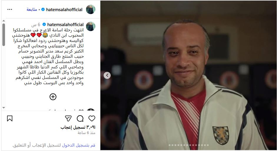 وكتب حاتم صلاح عبر حسابه بموقع انستجرام: انتهت رحلة أسامة الأعرج في مسلسلكوا المحبوب ابن النادي، هتوحشني كواليسه وهتوحشني ردود أفعالكوا، شكرًا لكل الناس حبايبي وصحابي المخرج الكبير كريم سعد، مدير التصوير حسام حبيب، المنتج طارق الجنايني، وحبيبي وبطل المسلسل الفنان أحمد فهمي.