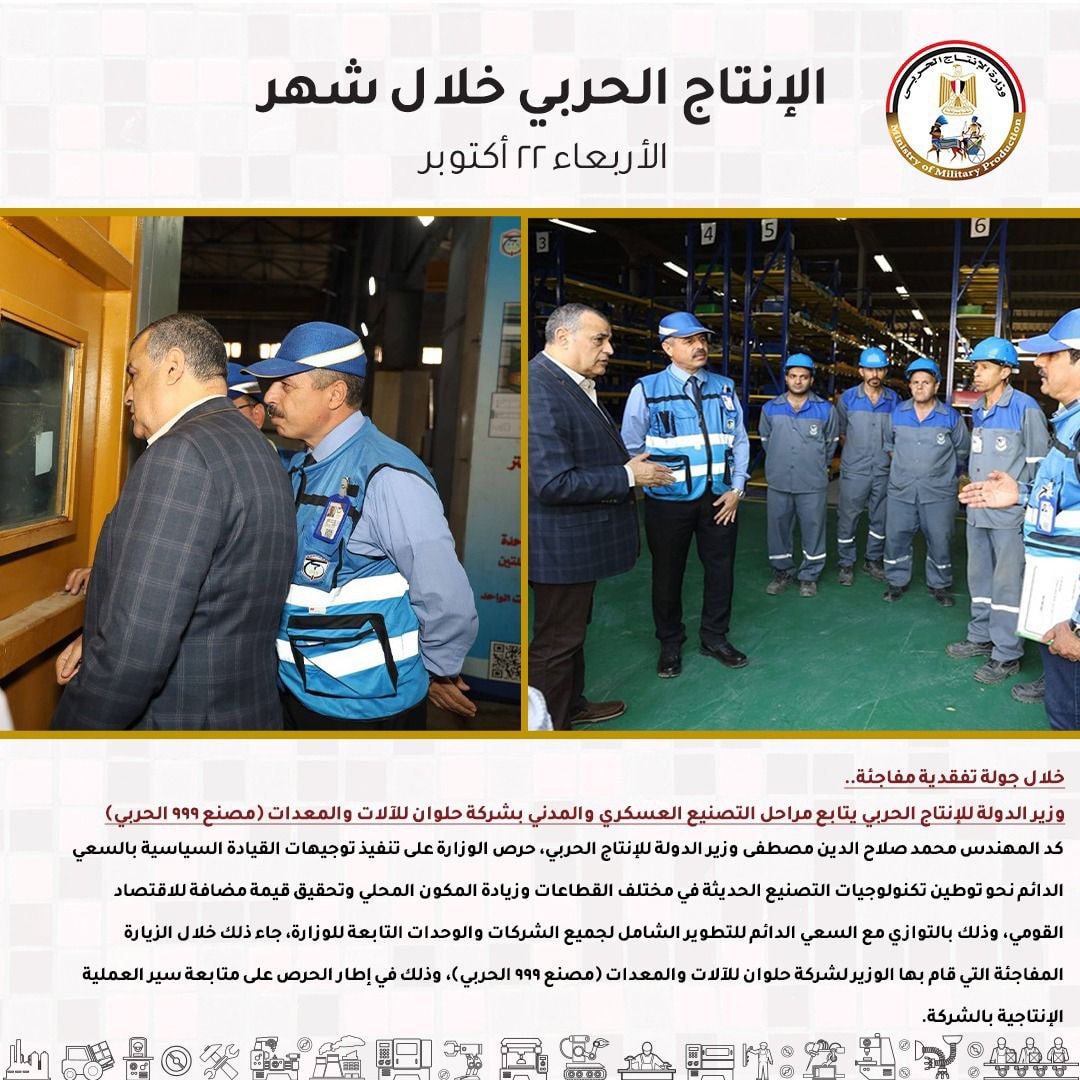 وزير الدولة للإنتاج الحربي يتابع مراحل التصنيع العسكري والمدني بشركة حلوان للآلات والمعدات (مصنع 999 الحربي)