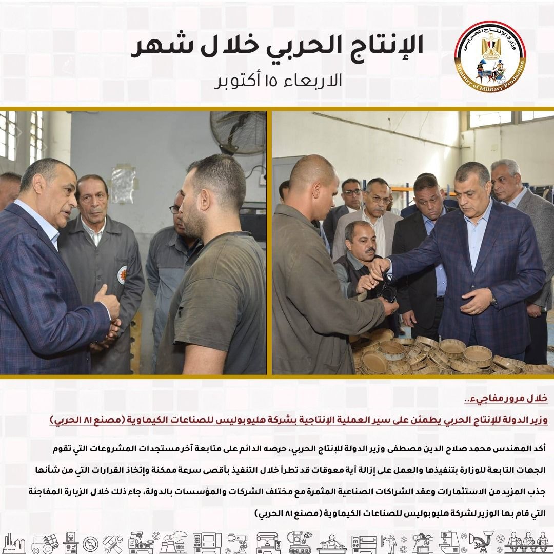 وزير الدولة للإنتاج الحربي يطمئن على سير العملية الإنتاجية بشركة هليوبوليس للصناعات الكيماوية (مصنع 81 الحربي)