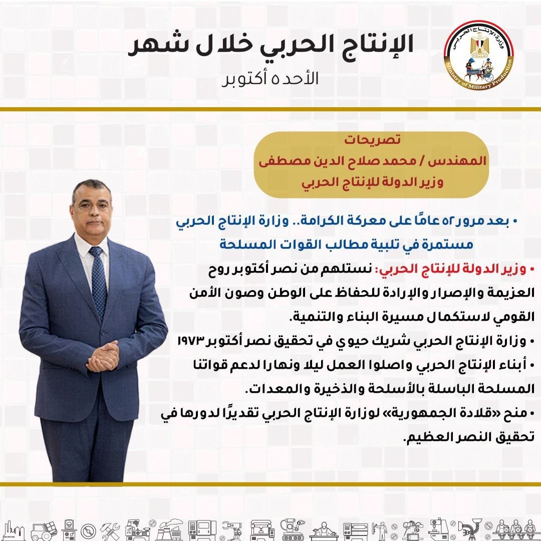 وزير الدولة للإنتاج الحربي: نستلهم من نصر أكتوبر روح العزيمة والإصرار والإرادة للحفاظ على الوطن وصون الأمن القومي لاستكمال مسيرة البناء والتنمية