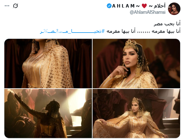 احتفلت المطربة الإماراتية أحلام المشهورة بلقب "الملكة"، بافتتاح المتحف المصري الكبير، حيث نشرت مجموعة صور لها باستخدام أدوات الذكاء الاصطناعي وهي ترتدي زي ملكات الفراعنة، مؤكدة على حبها وغرامها الشديد بمصر.