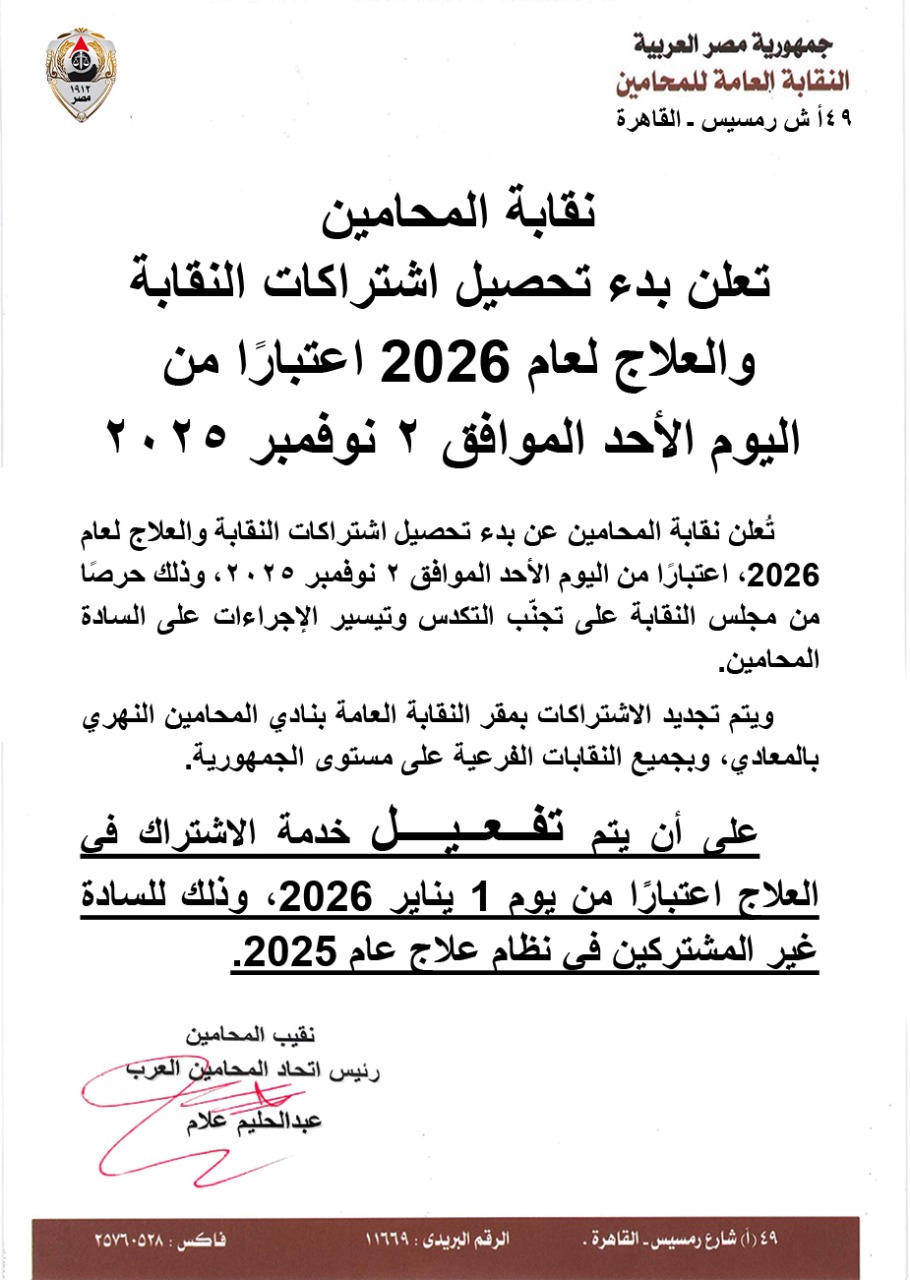نقابة المحامين تعلن بدء تحصيل اشتراكات النقابة والعلاج لعام 2026 اعتبارًا من اليوم الأحد الموافق 2 نوفمبر 2025