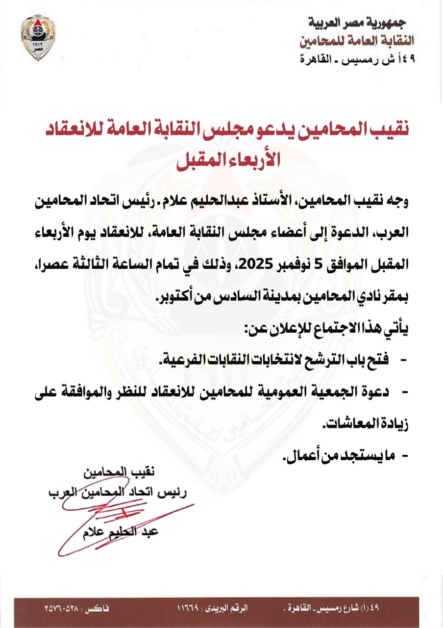 وجه نقيب المحامين، الأستاذ عبدالحليم علام ـ رئيس اتحاد المحامين العرب، الدعوة إلى أعضاء مجلس النقابة العامة، للانعقاد يوم الأربعاء المقبل الموافق 5 نوفمبر 2025، وذلك في تمام الساعة الثالثة عصرا، بـمقر نادي المحامين بمدينة السادس من أكتوبر.