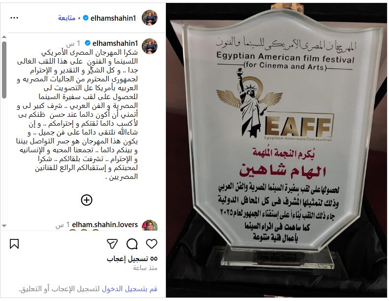 وأرفقت إلهام شاهين بالصورة تعليقًا، حيث قالت: شكرا المهرجان المصرى الأمريكي للسينما والفنون على هذا اللقب الغالى جدا، و كل الشكًِر و التقدير و الإحترام لجمهورى المحترم من الجاليات المصرية و العربية بأمريكا على التصويت لى للحصول على لقب سفيرة السينما المصرية و الفن العربي، شرف كبير لى و أتمني أن أكون دائما عند حسن ظنكم بى لأكسب دائما ثقتكم و إحترامكم، و إن شاءالله نلتقى دائما على فن جميل، و يكون هذا المهرجان هو جسر التواصل بيننا و بينكم دائما، تجمعنا المحبة و الإنسانية و الإحترام، تشرفت بلقائكم، شكرا لمحبتكم و إستقبالكم الرائع للفنانين المصريين .