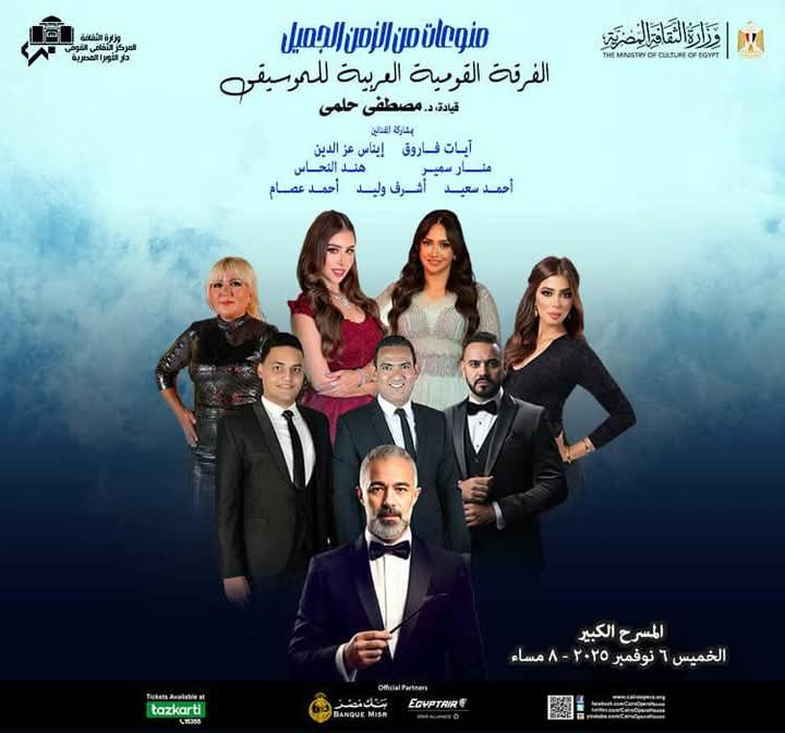 تنظم دار الأوبرا المصرية برئاسة الدكتور علاء عبد السلام حفلا لمجموعة مختارة من طربيات عمالقة زمن الفن الجميل وذلك ضمن خطط وزارة الثقافة لإعادة إحياء التراث تقدمها الفرقة القومية العربية للموسيقى المقام بقيادة المايسترو الدكتور مصطفى حلمى فى الثامنة مساء الخميس 6 نوفمبر على المسرح